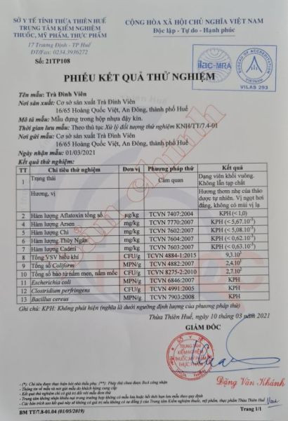 CSSX Trà Đình Viên được Sở Y Tế, Trung Tâm Kiểm Nghiệm Thuốc, Mỹ Phẩm, Thực Phẩm Tỉnh Thừa Thiên Huế cấp giấy kết quả thử nghiệm các thành phần trong viên trà đảm bảo an toàn cho sức khỏe người tiêu dùng.