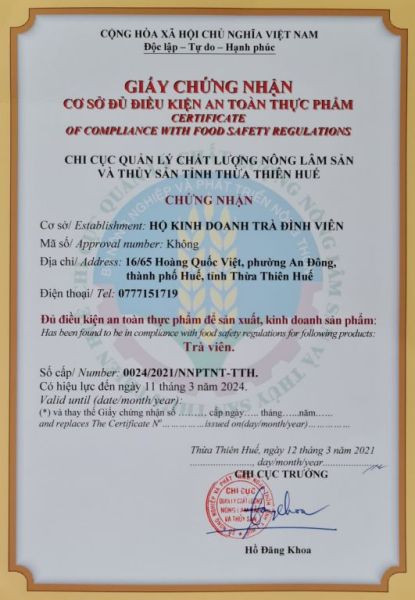 CSSX Trà Đình Viên được Chi Cục Quản Lý Chất Lượng Nông Lâm Sản và Thủy Sản Tỉnh Thừa Thiên Huế chứng nhận đủ điều kiện an toàn thực phẩm để sản xuất kinh doanh sản phẩm trà viên.